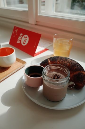 tři vejce na měkko ⋅ sýr asiago ⋅ hnědé máslo s chilli ⋅ chlebový crunch ⋅ šlehané máslo ⋅ chléb (1,3,7)