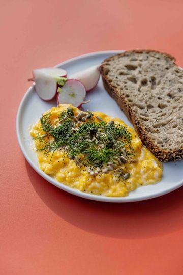 tři míchaná vejce ⋅ pažitkový olej ⋅ posypka z lískových ořechů & sezamu ⋅ šlehané máslo ⋅ nakládaná zelenina ⋅ chléb (1,3,7,8,9,11)