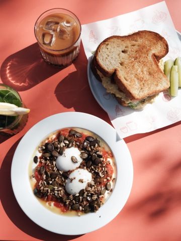 slaný tvaroh ⋅ dvě vejce na hniličku ⋅ zeleninové ragú ⋅ šalvějové máslo ⋅ lískové ořechy ⋅ sezam ⋅ chlebový crunch ⋅ chléb (1,3,7,8,9)